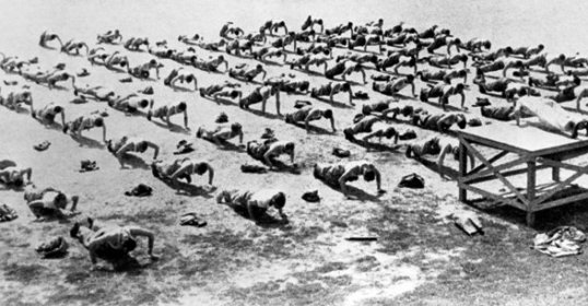 The Army first introduced a formal fitness test to the troops in 1942. Millions of men were being called up to fight in World War II, and not all of them were prepared for the rigors of combat. To get the men in fighting shape, the Army implemented a systematic physical development program as part of the Combat Basic Training course. And the Army Ground Forces Test was designed to assess whether the program was having its desired effect. The test included squat jumps, sit-ups, pull-ups, push-ups, and a 300 yard run. The emphasis was on functional fitness and giving American GI’s the strength, mobility, and endurance they would need to tackle real tasks on the battlefield.